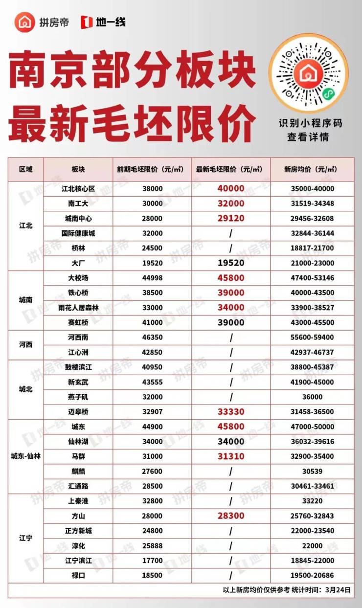 铁心桥此前较高38500元/㎡,现在毛坯限价39000元/㎡;浦口城南中心此前较高28000元/㎡,现在毛坯限价29120元/㎡;江北核心区此前较高38000元/㎡,现在毛坯限价40000元/㎡。
