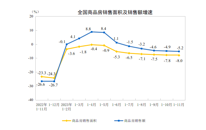 在当日上午国新办举行的新闻发布会上,国家统计局新闻发言人刘爱华表示,随着经济整体恢复和一系列优化调整的政策持续发挥显效,房地产领域一些主要指标呈现边际改善迹象。但从1-11月全国房地产开发投资、商品房销售面积等数据来看,房地产目前仍然处于调整之中。