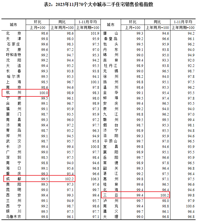 值得注意的是,11月70城中二手房价格环比上涨的城市数量为零,只有杭州保持不跌也不涨,其余69城均环比下降;二手房价格同比上涨的城市仅有2个,分别为成都和三亚。