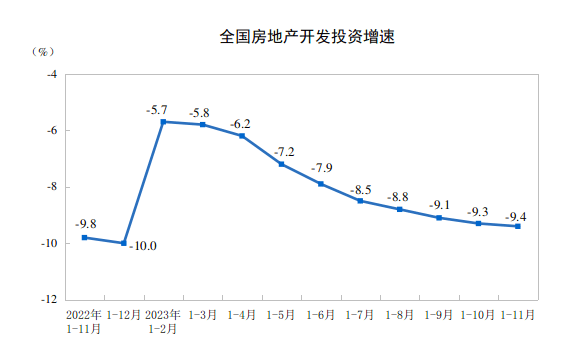 1-11月,全国房地产开发投资104045亿元,同比下降9.4%,其中住宅投资下降9.0%。
