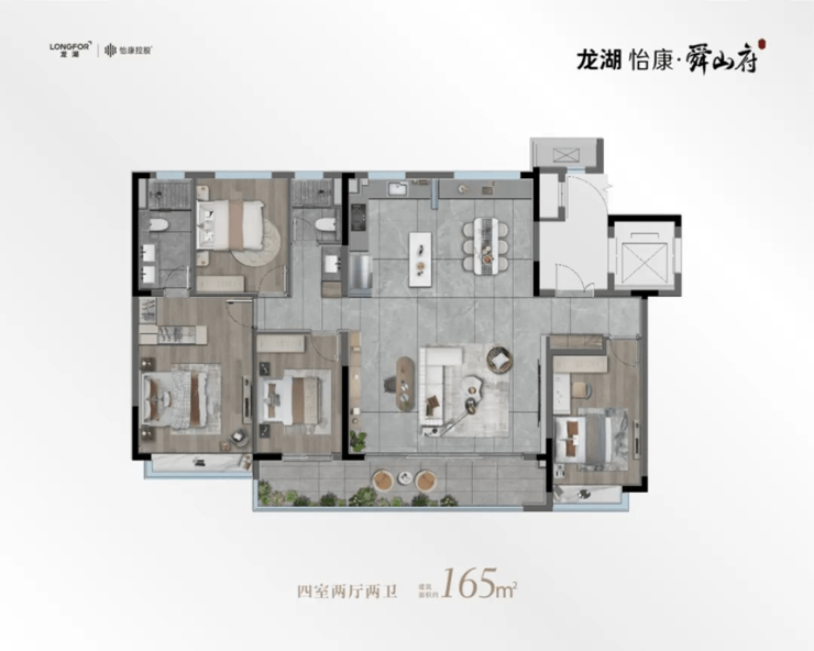 建面约165㎡的大四房户型,是市面上罕见的五面宽、三面宽阳台户型。