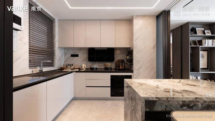 除了收纳功能的强大,万科 朗拾|雨核也对居家的社交方式进行了重新审视。在建面约99/115/139㎡三个不同的户型中,设计师根据空间情况打造不同类型的开放式厨房,分别通过通透性厨房、可自由开合的推拉门+类岛台、三轨折叠移门+洄游式岛台的独特设计,突破传统厨房与外界的空间屏障,有效延伸视觉空间。