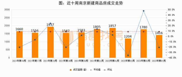 进入2025年第04周(01月20日-01月26日),南京新建商品房成交1416套,较上周减少364套,环比下降20.4%