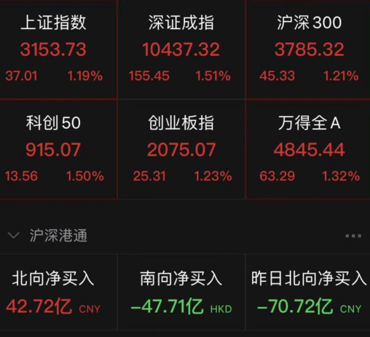 受上述利好消息刺激,A股三大股指下午开盘走强,截至发稿,创业板指拉升涨逾1%,沪指涨1.19%,深成指涨1.51%。医药医疗、油气、煤炭等方向涨幅居前,两市上涨个股近4000只。截至发稿,北向资金净流入超40亿元。