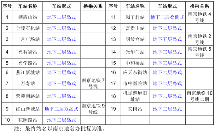 该线路共设置19座车站,全部为地下车站,可与地铁7号线、9号线、2号线、4号线、5号线和10号线二期等实现换乘。