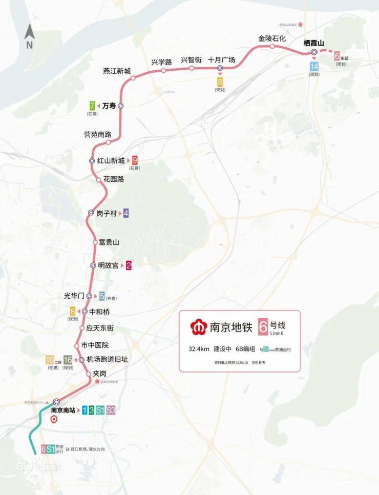 地铁6号线北起栖霞山站,途经栖霞区、玄武区、秦淮区、雨花台区和江宁区,串联起栖霞山、南京经济技术开发区、燕子矶、黑墨营、紫金山、光华门、南部新城地区,南至南部新城的南京南站,全线呈南北走向,全长32.365千米。