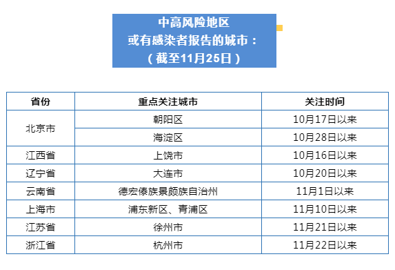 11月25日,杭州市、徐州市在确诊病例密切接触者排查中发现核酸检测阳性,经诊断为无症状感染者。为严格落实“外防输入、内防反弹”的防控要求,有效控制和降低疫情传播风险,保障全市人民的健康,南京市疾控中心再次发出如下紧急提醒: