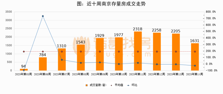 存量房方面,第14周南京存量房成交1631套,较上周减少574套,环比下降26%。从近十周成交走势来看,周均成交套数为1604套,本周高于平均水平1.7%。
