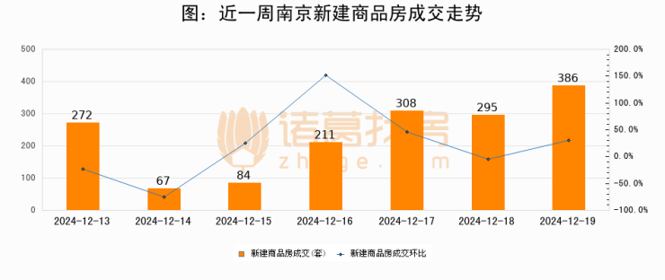 根据南京市住房保障和房产局数据显示,2024年12月19日南京新建商品房成交386套,较昨日增加91套,环比上涨30.9%