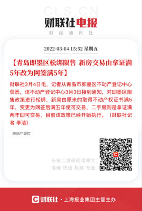 3月4日,青岛即墨区松绑限售,新房交易由拿证满5年改为网签满5年,二手房则是拿证满2年交易。