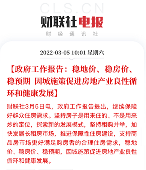 3月5日,第十三届全国人民代表大会第五次会议正式召开,政府工作报告有关房地产的较新表述中提到:支持商品房市场更好满足购房者的合理住房需求;稳地价、稳房价、稳预期,因城施策促进房地产业良性循环和健康发展。