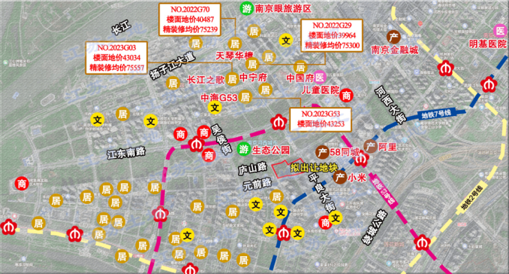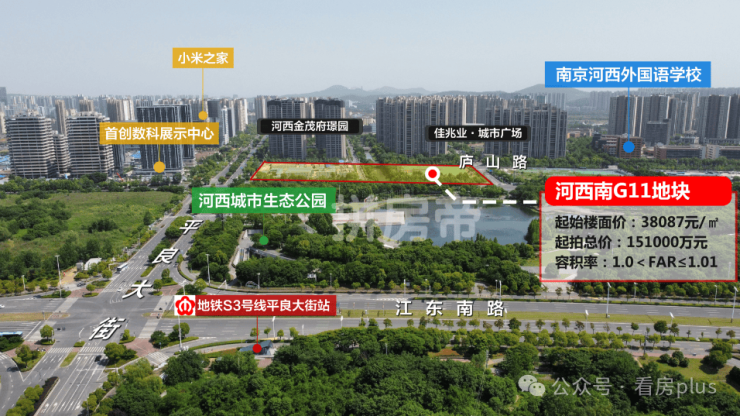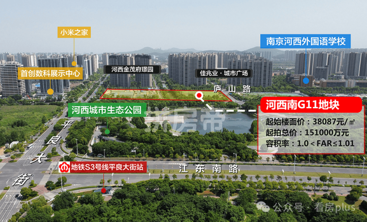地块位于河西城市生态公园南侧,距地铁S3号线平良大街站仅约450米,阿里巴巴江苏总部、小米华东总部等都在旁边,北侧还有河西金融城。