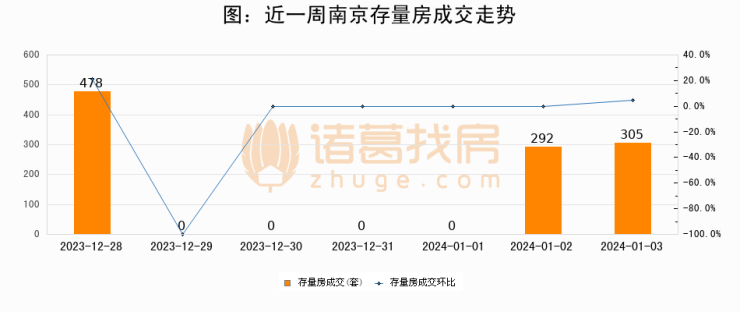 从存量房来看,2024年01月03日南京存量房单日成交305套,比昨日增加13套,环比上涨4.5%。从近一周存量房成交来看,南京存量房日均成交套数为153套,01月03日单日成交305套,高于近一周平均水平99.3%。