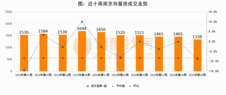 存量房方面,第36周南京存量房成交1338套,较上周减少127套,环比下降8.7%。从近十周成交走势来看,周均成交套数为1530套,本周低于平均水平12.5%。