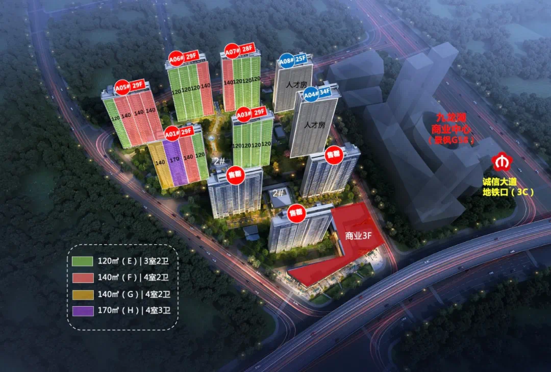 项目位于九龙湖商圈诚信大道与长亭街交汇处,靠近地铁3号线诚信大道站,未来可在此处换乘地铁5号线(正在建设中),交通非常便捷。目前九龙湖板块内在售新房不多,仅有金隅紫京云著和弘阳悦禧,弘阳悦禧为叠墅产品,因此许多买房人等金隅。