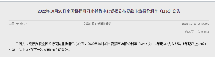 中国人民银行授权全国银行间同业拆借中心公布,2022年10月20日贷款市场报价利率(LPR)为:1年期LPR为3.65%,5年期以上LPR为4.3%。以上LPR在下一次发布LPR之前有效。