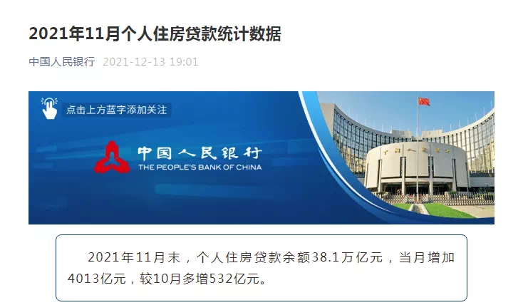 12月13日,央行官微发布11月份个人住房贷款统计数据。11月末,个人住房贷款余额38.1万亿元,当月增加4013亿元,较10月份多增532亿元。