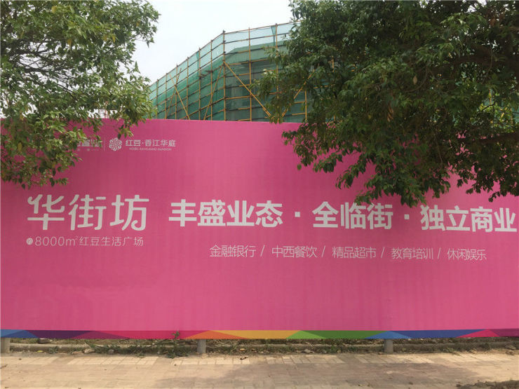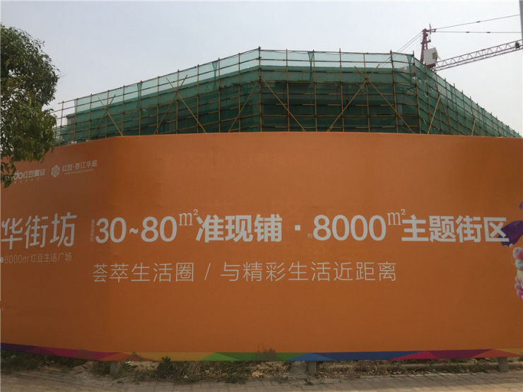 从户外广告大牌可以知道,商业部分叫“华街坊”,将打造8000平米的主题街区,面积约30-80平米,据了解,工作人员透露,红豆香江华庭计划6、7月首开商铺,虽然价格没定,在肯定要在3万左右。