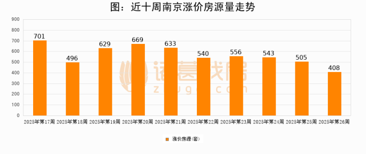 从调价房源来看,第26周南京涨价房源408套,较上周下降19.2%。与此同时,26周涨价房源占比回落0.49个百分点,业主信心小幅波动,购房者可则需入市。