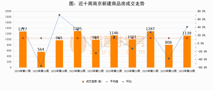 进入2025年第26周(06月23日-06月29日),南京新建商品房成交1139套,较上周增加333套,环比上涨41.3%。从近十周成交来看,周均成交套数为1046套,本周成交1139套,高于近十周平均成交量8.9%。