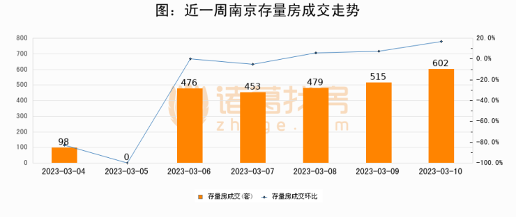 从存量房来看,2023年03月10日南京存量房单日成交602套,比昨日增加87套,环比上涨16.9%。从近一周存量房成交来看,南京存量房日均成交套数为374套,03月10日单日成交602套,高于近一周平均水平61%。