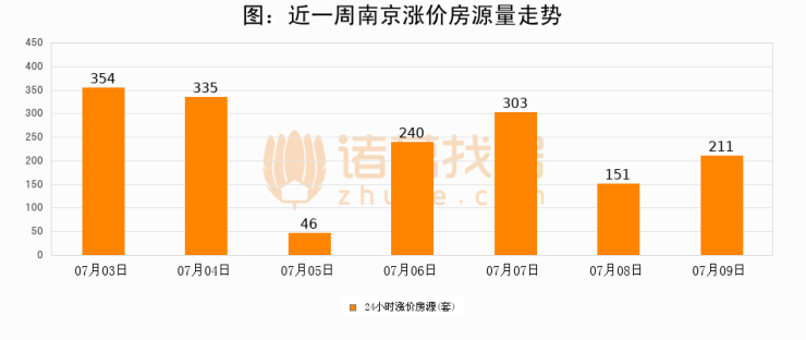 根据诸葛找房数据显示,南京24小时涨价房源量为211套,较07月08日增加60套,环比上涨39.7%。与此同时,涨价房源占比小幅扩大,业主信心有所提升。