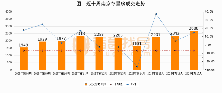 存量房方面,第17周南京存量房成交2688套,较上周增加346套,环比上涨14.8%。从近十周成交走势来看,周均成交套数为2112套,本周高于平均水平27.3%。