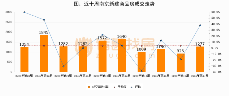 进入2025年第17周(04月21日-04月27日),南京新建商品房成交1277套,较上周增加352套,环比上涨38%