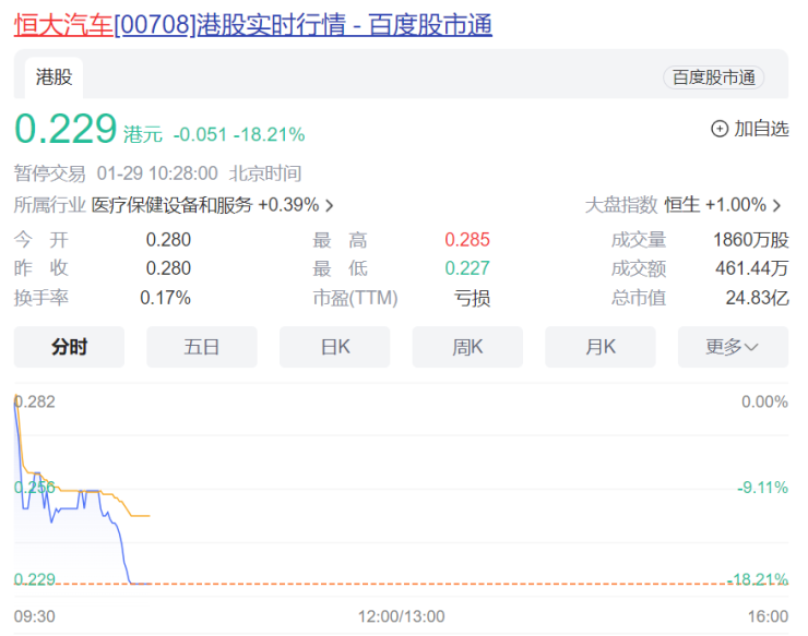 随后中国恒大、恒大汽车、恒大物业盘中停牌。停牌前中国恒大股价跌超20%,恒大汽车跌超18%。