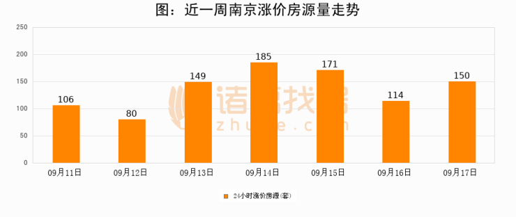 根据诸葛找房数据显示,南京24小时涨价房源量为150套,较09月16日增加36套,环比上涨31.6%。与此同时,涨价房源占比小幅扩大,业主信心有所提升。