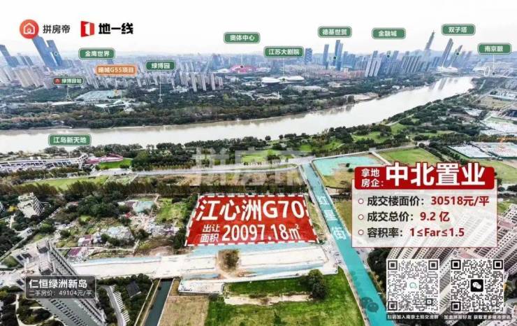 去年11月25日,江心洲G70地块被中北置业底价拿下,成交总价9.2亿元,成交楼面价30518元/㎡。
