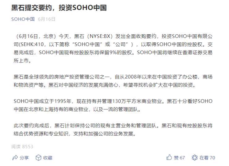 据新京报,早在2020年3月,就有消息称黑石集团正与SOHO中国就私有化进行谈判,交易价值40亿美元(约258亿人民币)。2020年3月11日晚间,SOHO中国发布公告称,公司在与海外金融投资者洽谈,以探讨进行战略合作的可能性,其可能导致公司全部已发行股份作出全面要约。