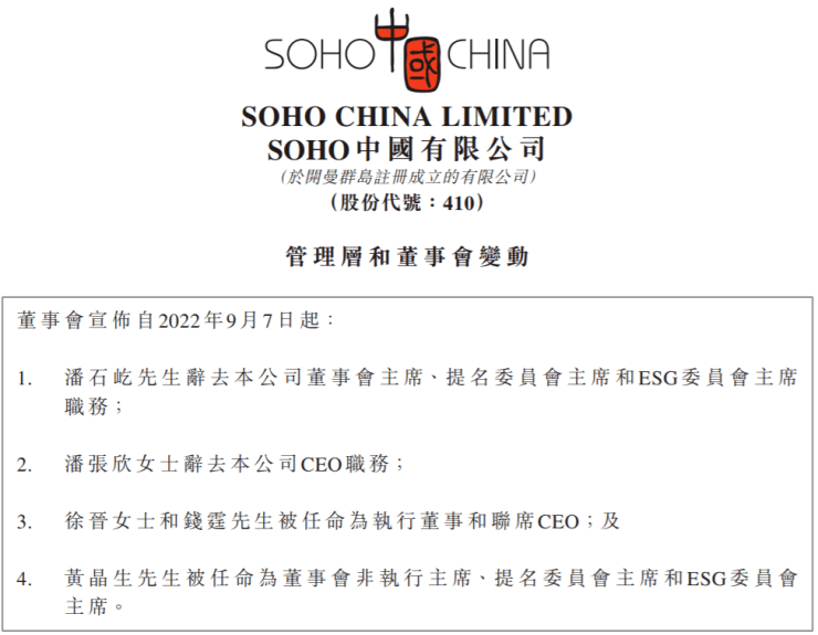 9月7日午间,SOHO中国(HK00410)突发公告,潘石屹辞去本公司董事会主席、提名委员会主席和ESG委员会主席的职务,以专注于支持艺术和慈善事业;潘张欣辞去本公司行政总裁(CEO)职务,以专注于支持艺术和慈善事业。即日生效。