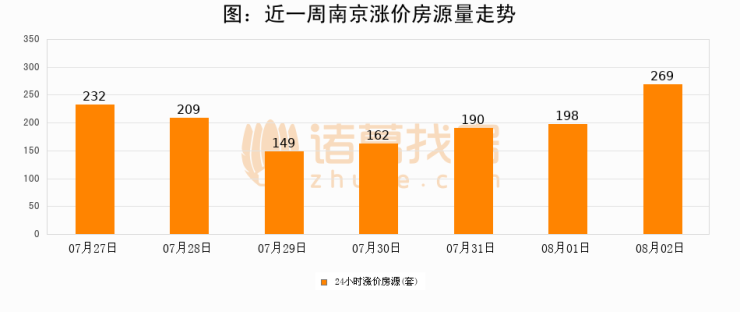 根据诸葛找房数据显示,南京24小时涨价房源量为269套,较08月01日增加71套,环比上涨35.9%。与此同时,涨价房源占比小幅扩大,业主信心有所提升。