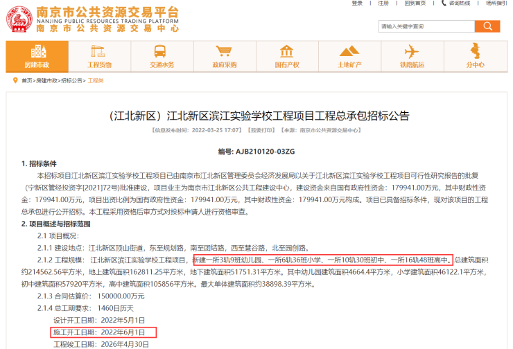 距南京市公共资源交易中心官网显示,江北新区滨江实验学校正式中标,总投资约179941万,新建从幼儿园到高中的全站教育配套,总建筑面积约21万方。