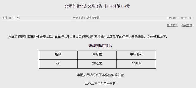 红星新闻6月13日消息,央行公告称,为维护银行体系流动性合理充裕,当日以利率招标方式开展20亿元7天期逆回购操作,中标利率1.9%,上次为2.0%,下调10个基点。