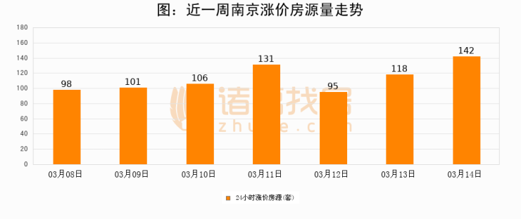 根据诸葛找房数据显示,南京24小时涨价房源量为142套,较03月13日增加24套,环比上涨20.3%。与此同时,涨价房源占比小幅扩大,业主信心有所提升。