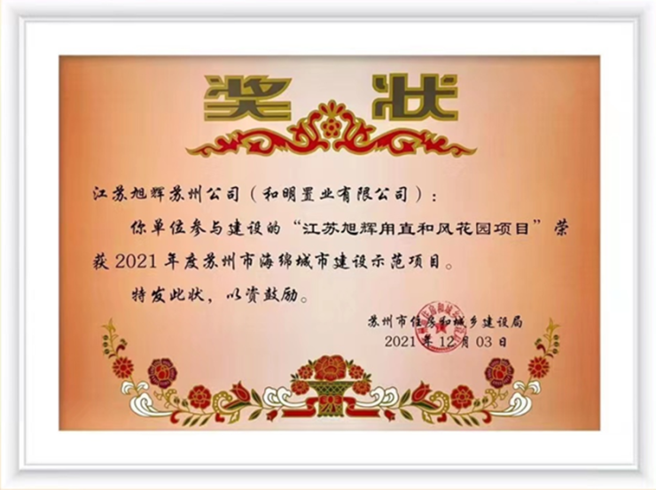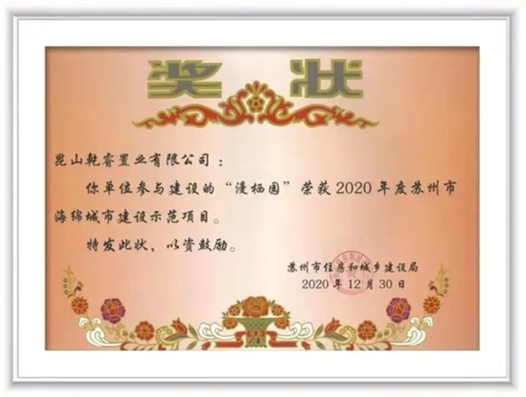 江苏旭辉经过三年的不断尝试和实践,从单项目的落地实验到各城市之间的普及,不断尝试社区海绵的各种形式,同时也取得了些许阶段性成果,从20年的昆山漫栖园到21年苏州和风,分别获得苏州市海绵城市建设示范项目。
