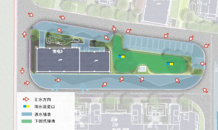 三类汇水分区主要为海绵城市与景观结合的下沉滑板广场。这部分的海绵设施主要收集周围道路上的雨水,大部分雨水通过透水面层下渗,局部的雨水滞留,形成一个小型的蓄水空间。在滑板广场地形的高点处设置溢流口,防止暴雨时候的雨水来不及下渗的情况。