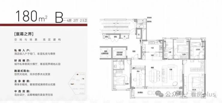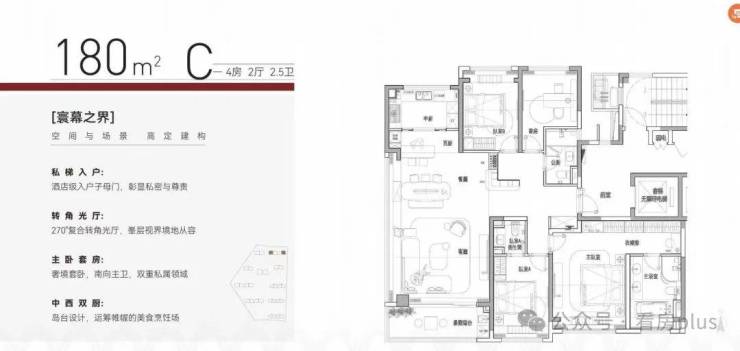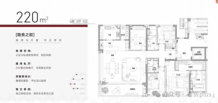 220㎡户型是4房3卫设计,打造了270°复合转角厅,双套房设计,主卧的衣帽间非常大,此外还有独立的家政间。
