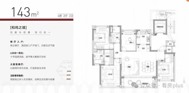 起步143㎡户型4房2卫,独立梯厅,入户子母门,LDKB一体化设计,无浪费空间,大面宽横厅,中西双厨,同时主卧套房打造了独立步入式衣帽间。但客卫离卧室未免有些太近了。