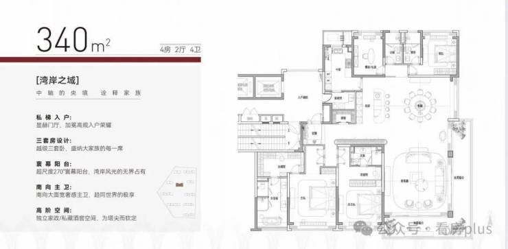 340㎡户型4房4卫设计,打造了270°环幕阳台,视野景观非常棒。主卧带超大卫生间,而且还是南向的,酒窖、家政间也一应俱全。