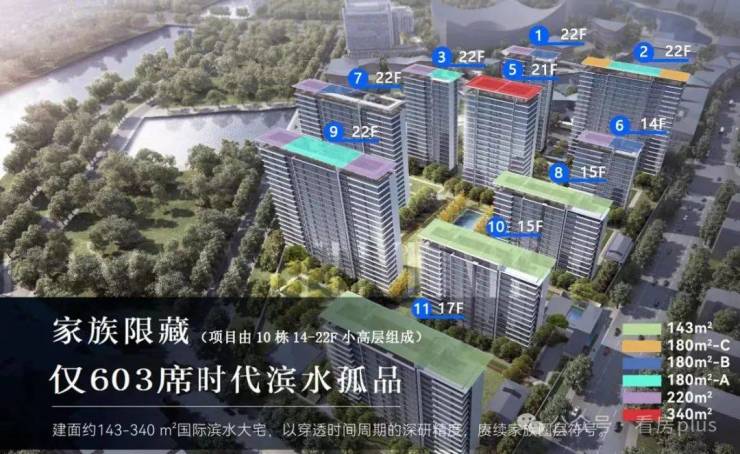 2、项目由10栋14-22层小高层组成,仅603套房,户型面积分别为143㎡、180㎡(三种)、220㎡以及340㎡,户型图已经曝光,后文会放。