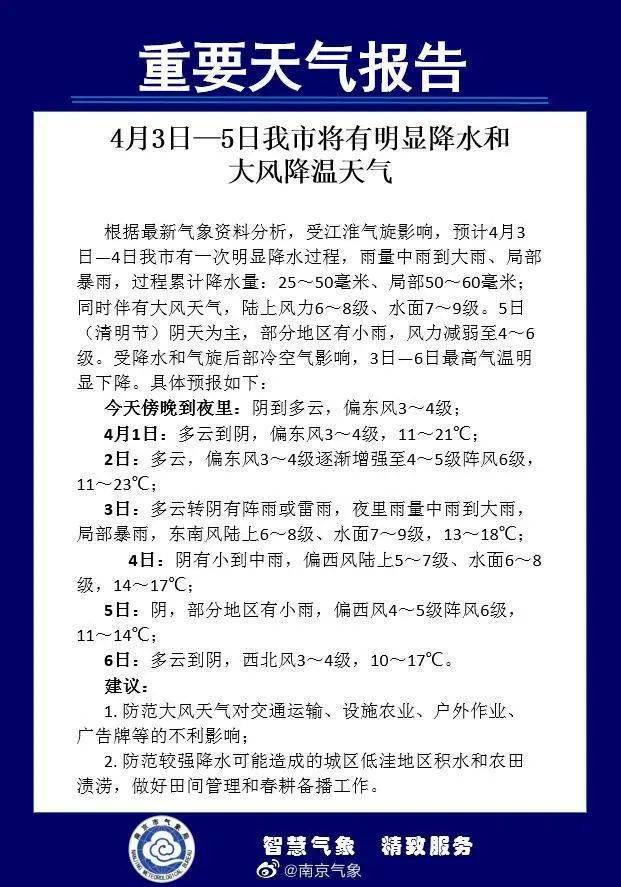 根据最新气象资料分析,3月31日—4月1日江苏多云到阴,苏南局部地区有小雨,2日全省天气晴好。4月3日—5日,受东移江淮气旋影响,江苏自西向东将出现大风、强降雨和降温天气。本次过程影响范围广,风力大,降雨强。