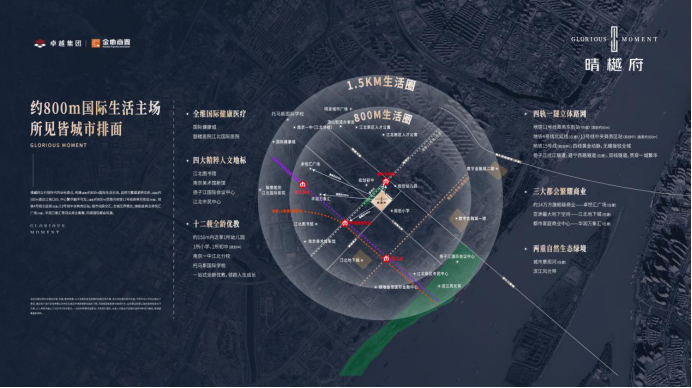 以晴樾府为圆心的直距约800m的国际生活主场内,交通、学校、商业等城市资源一应俱全。