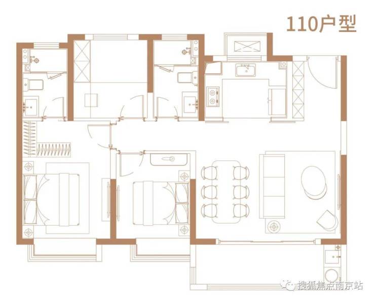 建面约110㎡,打造的是三房两厅两卫户型,动静分离设计,户型同样方正,做了大横厅设计,整体空间感非常奢阔。