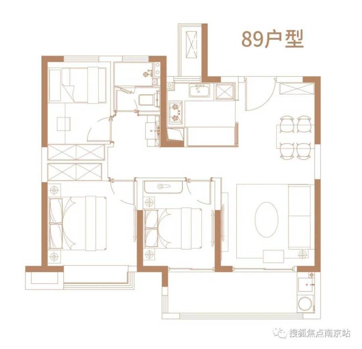 首先来看建面约89㎡三房两厅一卫设计,户型方正,南北通透,还有连通次卧与客厅的南向双阳台,堪称区域爆款户型!