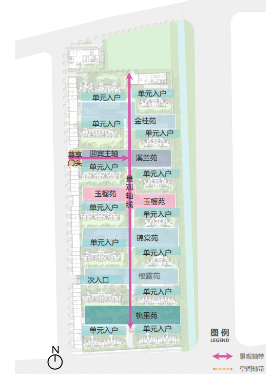 滨江孔雀城内部两轴六苑规划设计,穿插小区而过,并将其划分为东西两个苑区,向南延伸包围小区的东西两侧。