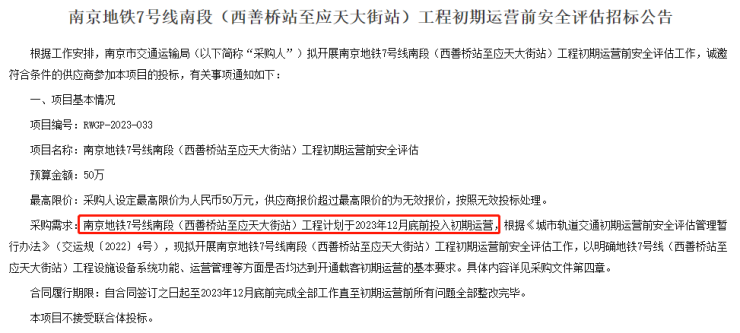 2、招标文件里明确:南京地铁7号线南段(西善桥站-应天大街站)工程计划于2023年12月底前投入初期运营。