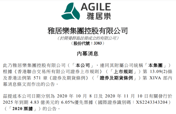 5月14日,雅居乐集团(HK03383,股价0.7港元,市值35.3亿港元)发布内幕消息公告称,鉴于公司面临的流动性压力,公司尚未支付于2020年发行的于2025年到期的4.83亿美元6.05%优先票据的利息,该利息支付的宽限期截止到2024年5月13日。公司预计无法履行其境外债务项下的所有付款义务。